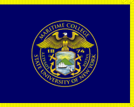 Mass Maritime, at Buzzards Bay, was established by the General Court of Massachusetts in 1891. The Regiment of Cadets, now numbering some 1,400, carries this blue regimental color bearing the academy seal.